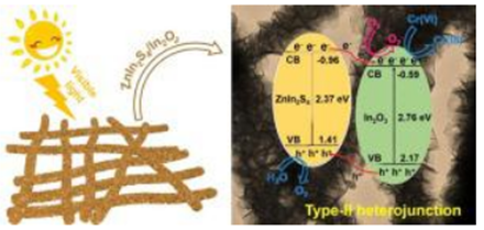 Well-designed heterostructure semiconductor photocatalysts can improve the activity of photocatalytic reactions. In this work, we constructed a series of hierarchical ZnIn2S4/In2O3 heterostructures by growing ultrathin two-dimensional ZnIn2S4 nanosheets onto one-dimensional In2O3 electrospun nanofibers and used them as photocatalysts for the efficient photoreduction of toxic Cr(VI). This structural design increased the specific surface area, promoted the separation of photogenerated electrons and holes, and provided more active sites for the catalytic reactions. Under visible light irradiation, the optimized ZnIn2S4/In2O3 photocatalyst showed the highest photocatalytic performance with 100% reduction efficiency for Cr(VI) (50 mg/L) within 90 min, which is much higher than pure In2O3 and ZnIn2S4. Additionally, the recycling tests and X-ray diffraction (XRD) characterization indicated the stability of the ZnIn2S4/In2O3 photocatalyst, making it a promising candidate for environmental remediation applications. Finally, the two active species (e˗ and ·O2˗) participating in the photoreduction process were determined via trapping experiments and electron spin resonance (ESR) spectroscopy. Finally, a possible mechanism for the ZnIn2S4/In2O3 heterojunction photocatalytic system was carefully determined.