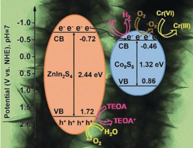 Visible-light-responsive hierarchical Co9S8/ZnIn2S4 tubular heterostructures are fabricated by growing 2D ZnIn2S4 nanosheets on 1D hollow Co9S8 nanotubes. This design combines two photoresponsive sulfide semiconductors in a stable heterojunction with a hierarchical hollow tubular structure, improving visible‐light absorption, yielding a large surface area, exposing sufficient catalytically active sites, and promoting the separation and migration of photogenerated charges. The hierarchical nanotubes exhibit excellent photocatalytic H2 evolution and CrVI reduction efficiency. Under visible‐light illumination, the optimized Co9S8/ZnIn2S4 heterostructure provides a remarkable H2 generation rate of 9039 μmol h−1 g−1 without the use of any co-catalysts and CrVI is completely reduced in 45 min. The Co9S8/ZnIn2S4 heterostructure is stable after multiple photocatalytic cycles.